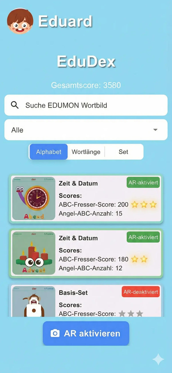 Die App leitet das Angel-ABC an, prüft die Buchstaben und macht Lernerfolge sichtbar. So siehst du im EduDex sofort, was dein Kind schon gemeistert hat. Für zielgerichtetes Spielen und Lernen. Leitet das Angel-ABC an, prüft Buchstaben und feiert Lernerfolge. So siehst du sofort, was dein Kind schon gemeistert hat.
