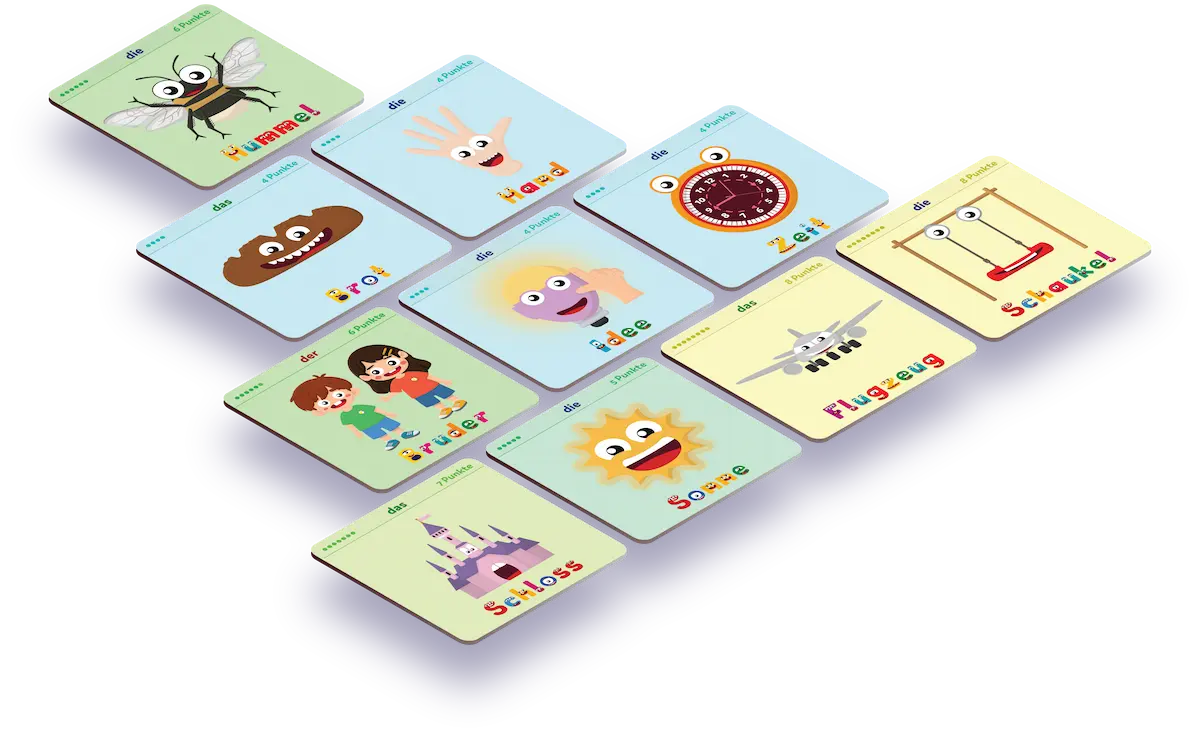 Stabiler Kartensatz bestehend aus 14 Wortkarten je Booster. Die Booster erweitern das Angel-ABC um zusätzliche Themen und Wortschätze — einfach Booster öffnen, Karten nutzen und (optional) in der App freischalten: