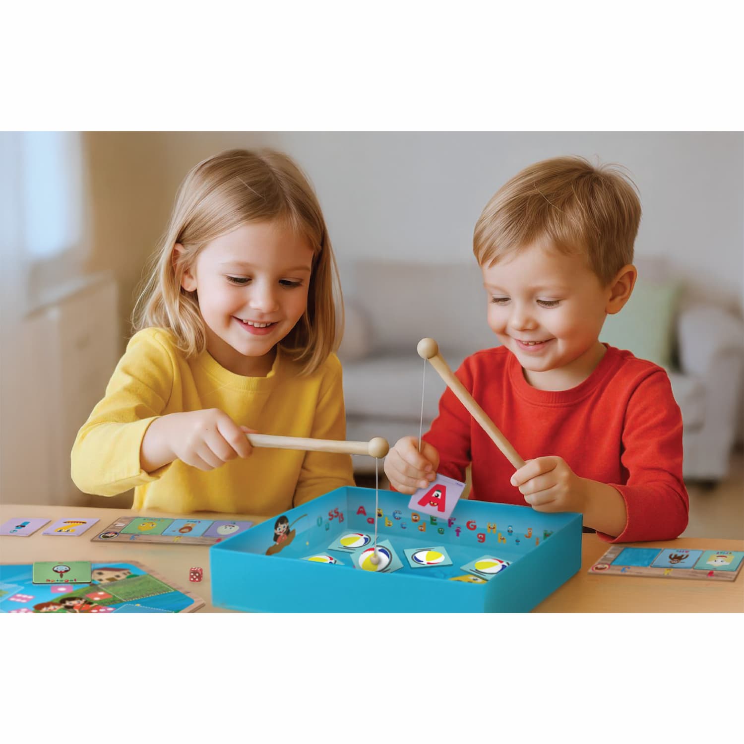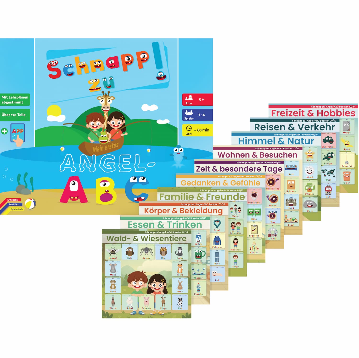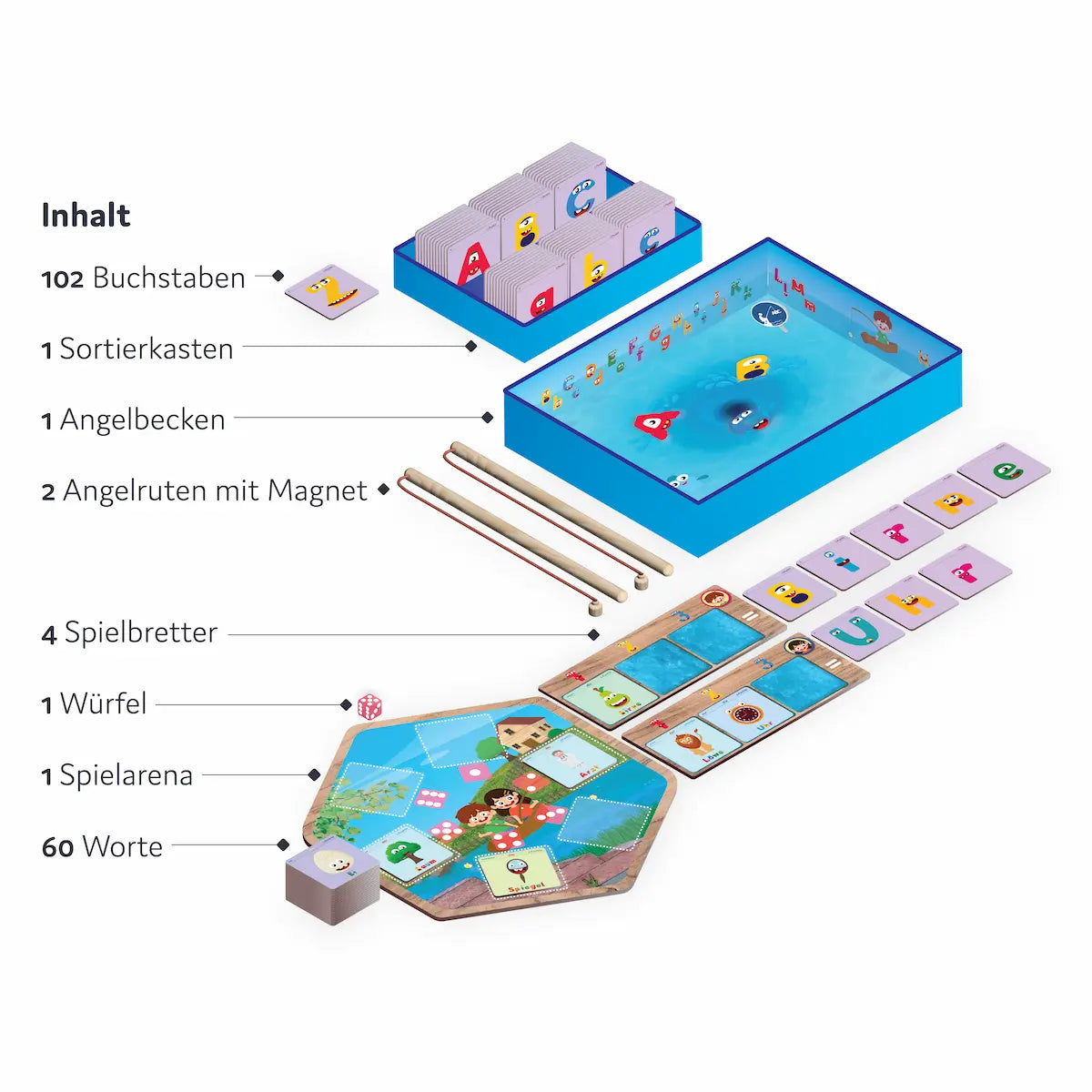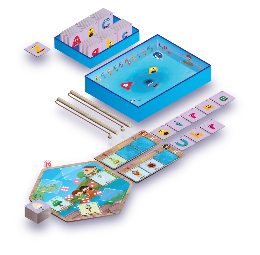 Mit 60 fantasievollen Wortkarten, 102 bunten Magnetbuchstaben und dem magischen Angelbecken wird jede Runde zum Abenteuer – perfekt abgestimmt auf die Lehrpläne der Grundschulen. Erwürfle dein Lieblingswort und angel dir mit Geschick und ein bisschen Glück genau die Buchstaben, die du brauchst. Wer clever sammelt, baut als Erster seine Wörter und wird zum Buchstabier-Meister!